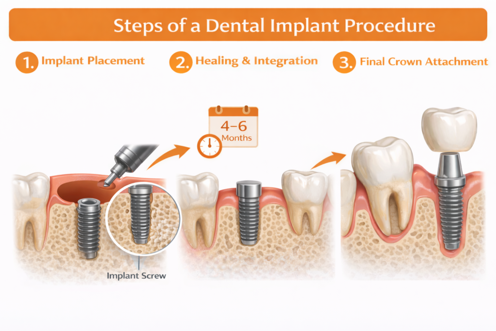 Depending on healing and bone integration, treatment can take 3–6 months from implant placement to final crown attachment.